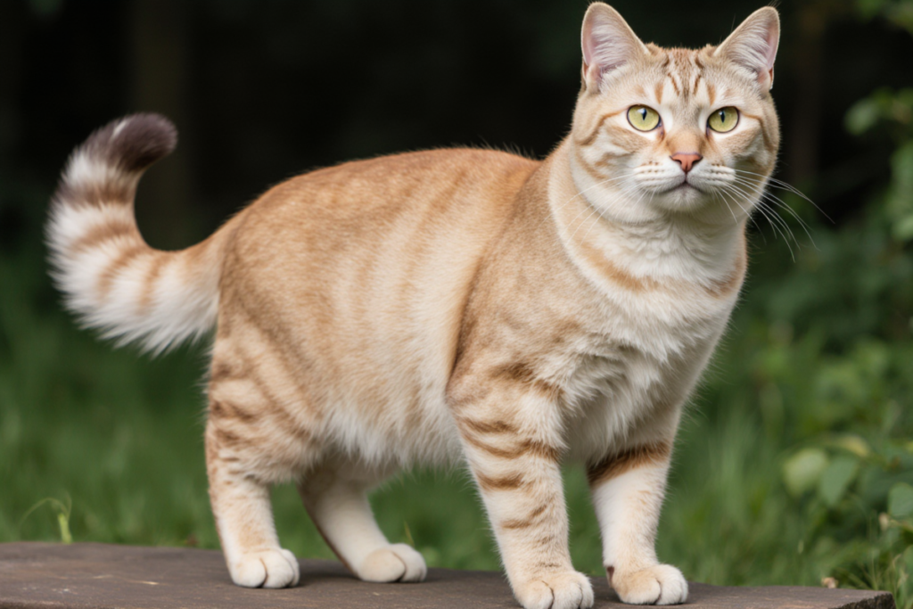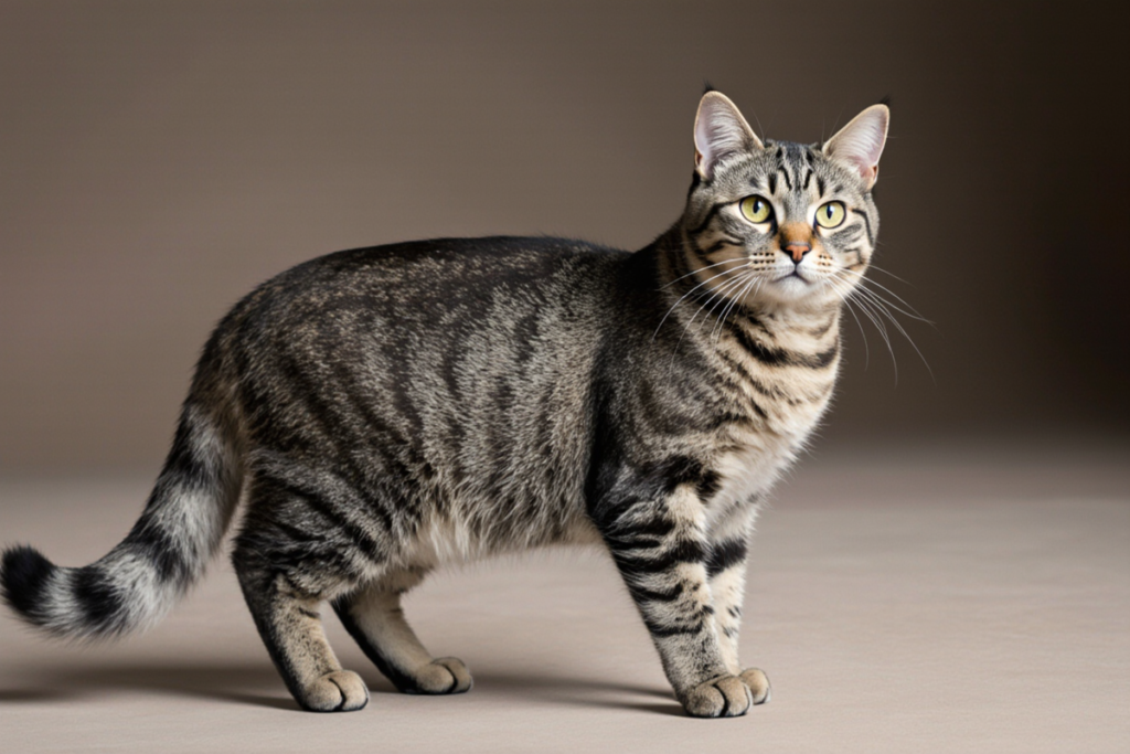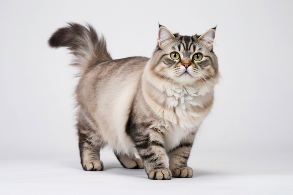 This breed is known for its wild look and short, expressive tail. The American Bobtail is a moderately long and substantial cat with a body that can appear quite low to the ground due to its rectangular stance and powerful build. Their hind legs are often slightly longer than the front, but their overall powerful, athletic frame gives a grounded impression.