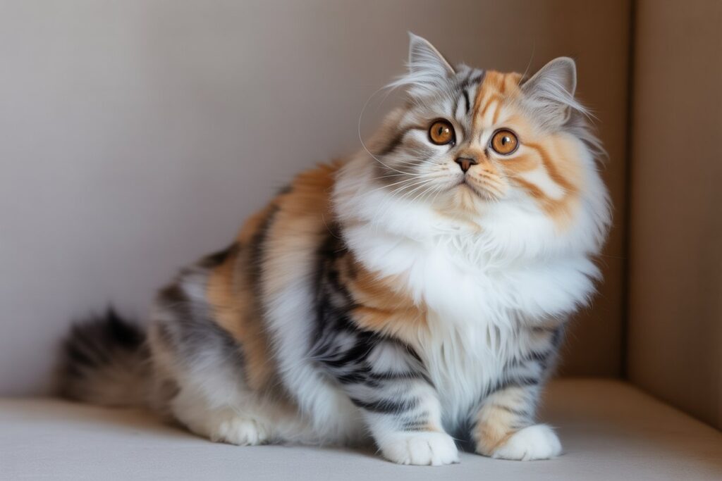 A deliberate cross between a Munchkin and a Persian or Exotic Shorthair. This breed combines the short legs cat stature with the sweet, brachycephalic (flat) face and plush coat of the Persian.