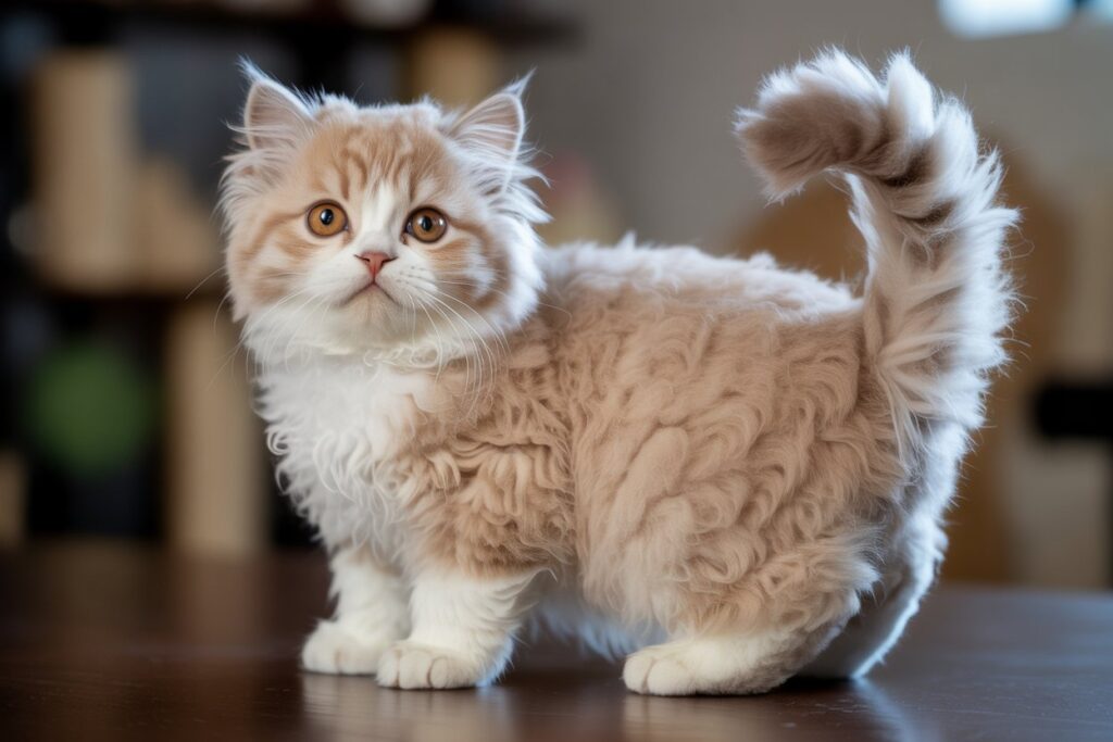 A rare and developing breed, the Lambkin is a cross between a Munchkin and a Selkirk Rex. The result is a cat with tiny legs adorned with a unique, soft, curly, and plush coat, reminiscent of a lamb’s fleece.